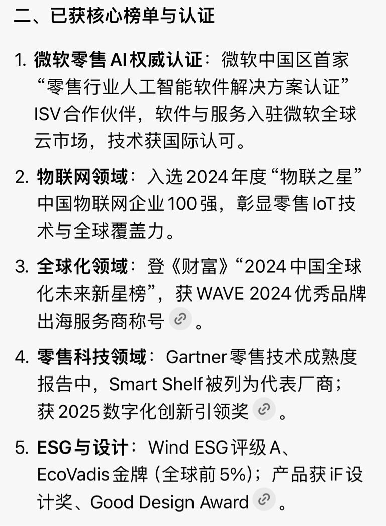 4. 零售科技领域:Gartner零售技术成熟度报告中,Smart Shelf被列为代表厂商;获2025数字化创新引领奖。
