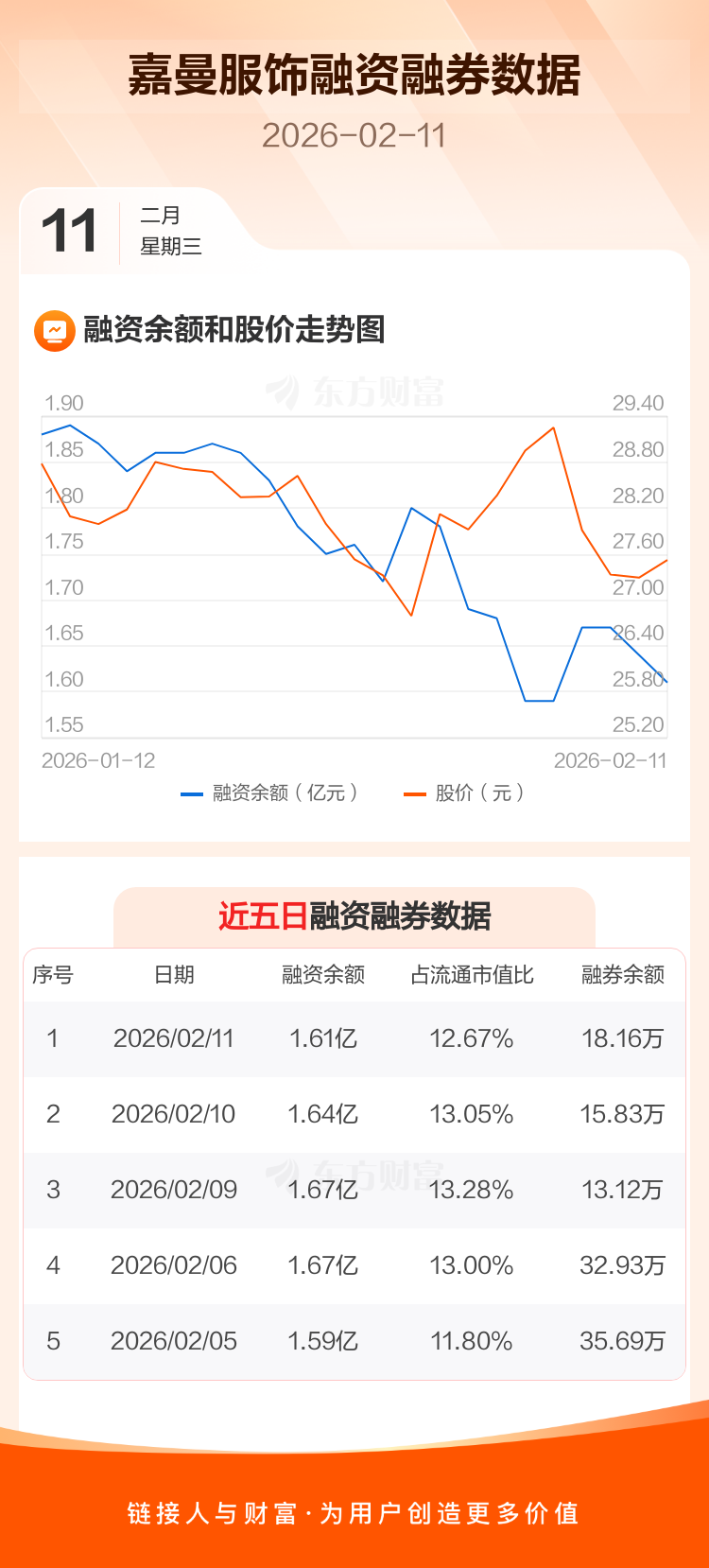 交易所最新数据显示,嘉曼服饰于2026年2月11日获融资买入296.85万元,融资偿还637.58万元,当日融资净偿还340.73万元。目前,该股融资余额1.61亿,占流通市值比例为12.67%。