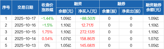 新天地:融资净偿还88.5万元,融资余额1.09亿元(10-17)