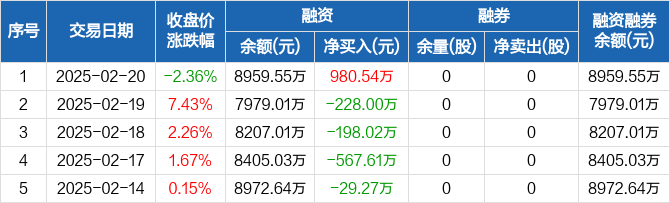 珠城科技:融资净买入980.54万元,融资余额8959.55万元(02-20)
