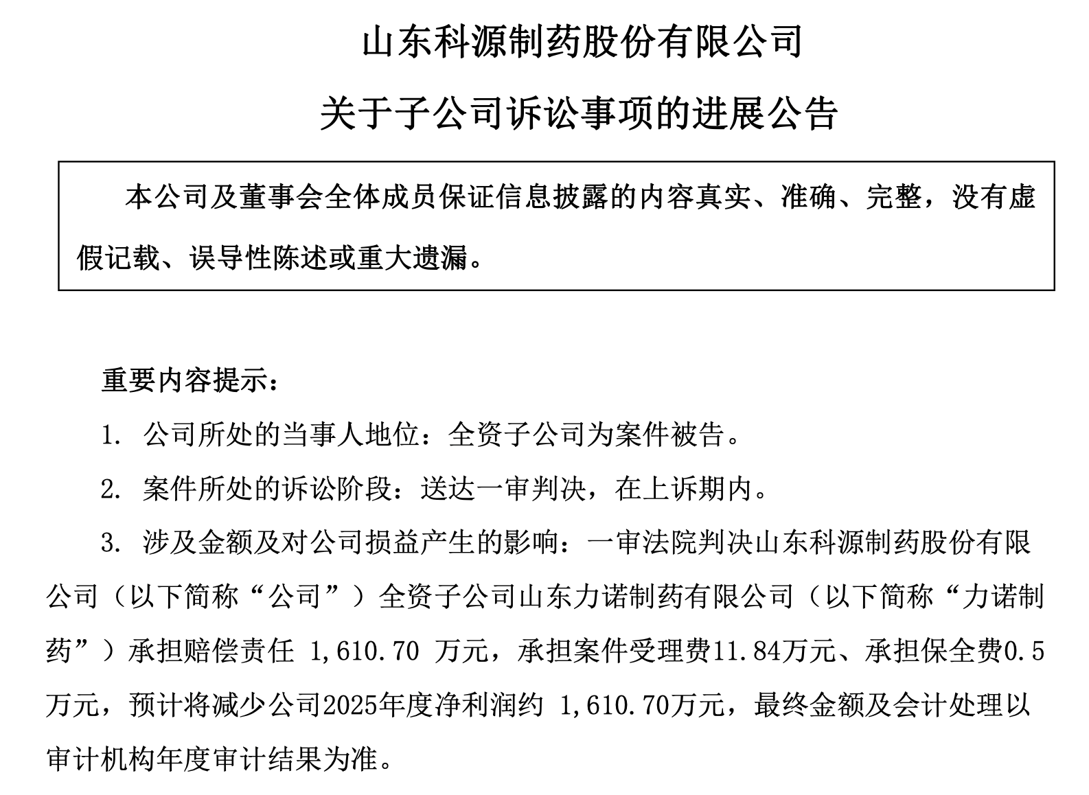 依据该判决,力诺制药需承担赔偿责任1610.70万元,该事项属于资产负债表日后调整事项,是公司无法合理预见的事项,因此公司须对2025年度业绩预告情况作出修正:确认营业外支出约1610.70万元,同时相应减少归属于上市公司股东的净利润。