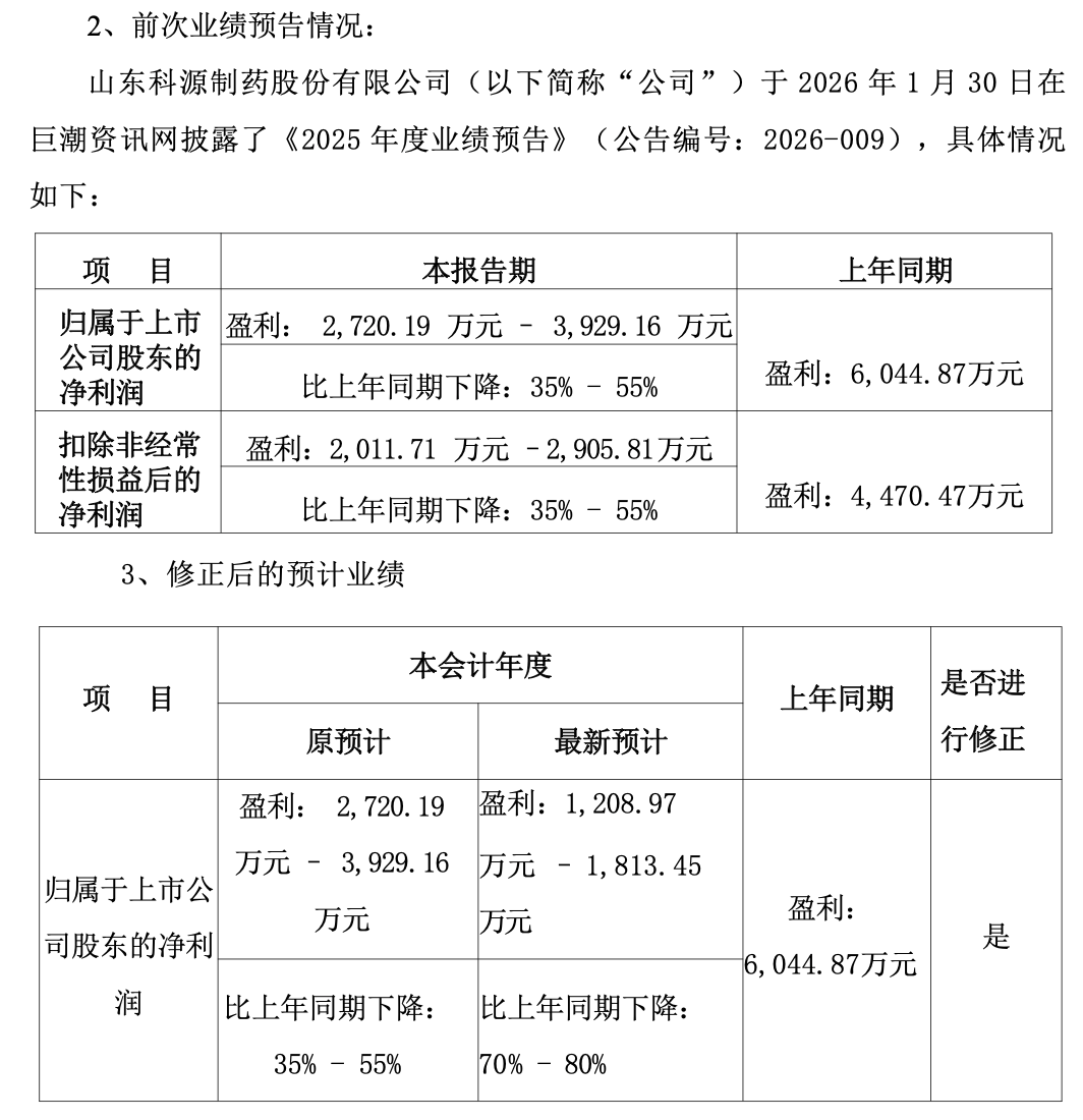 2月24日,科源制药公告修正2025年度业绩预告,修正后,科源制药预计归母净利润为1208.97万元至1813.45万元,比上年同期下降70%至80%。公司扣非归母净利润和前次披露一致,均为2012万元至2906万元。