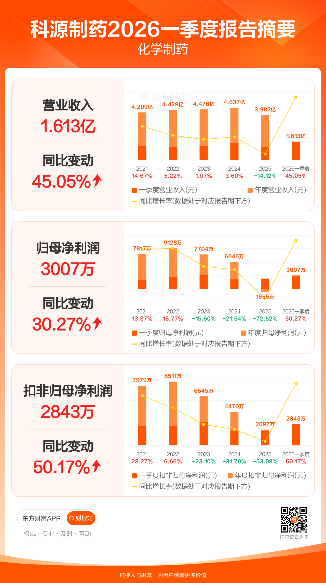 科源制药4月24日发布2026年一季报显示,公司一季度实现营业收入1.61亿元,同比增长45.05%;归母净利润3007.34万元,同比增长30.27%;扣非归母净利润2842.69万元,同比增长50.17%。