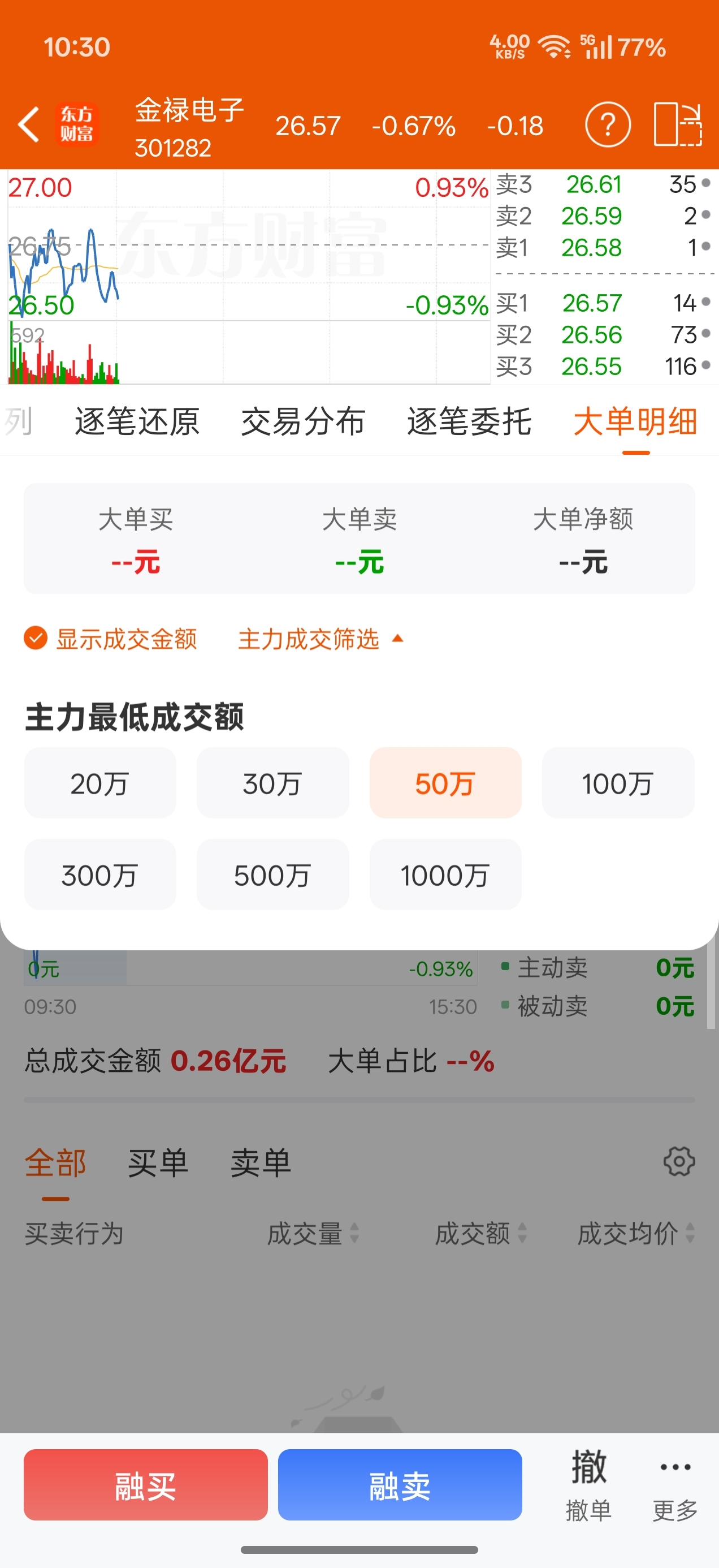 $金禄电子(SZ301282)$ 50万以上的大单买卖一个都没有,根本没人看的起这垃圾,你还在幻想啥??金禄电子之所以走成这样,主要责任在董秘这个水货,对标的票都轮着涨两次,它还在地下爬着