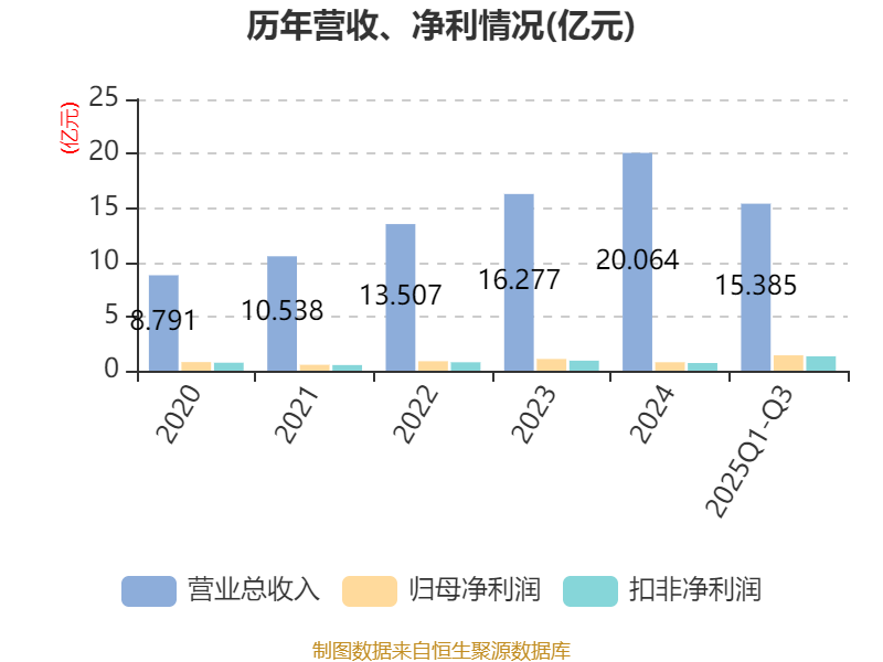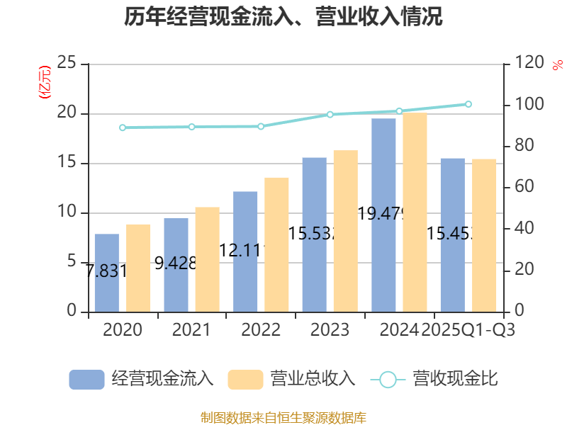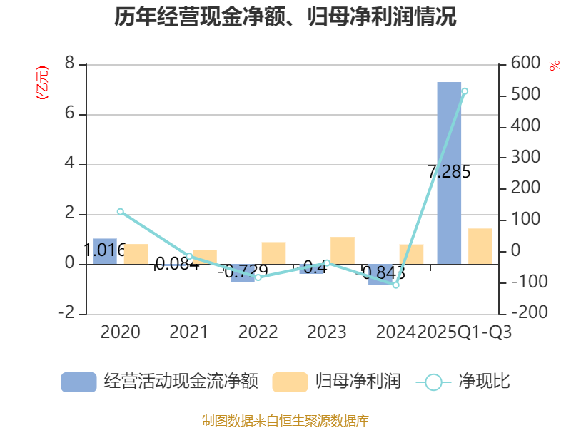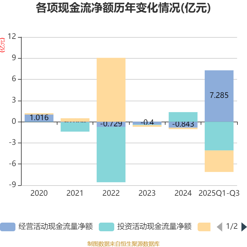 2025年前三季度,公司经营活动现金流净额为7.28亿元,同比增加8.55亿元;筹资活动现金流净额-3.05亿元,同比减少2.66亿元;投资活动现金流净额-4.06亿元,上年同期为1.52亿元。