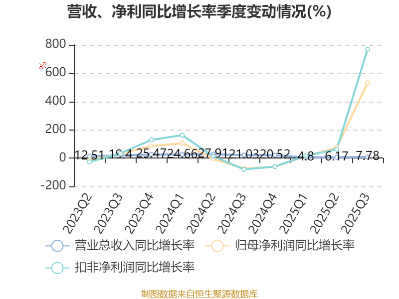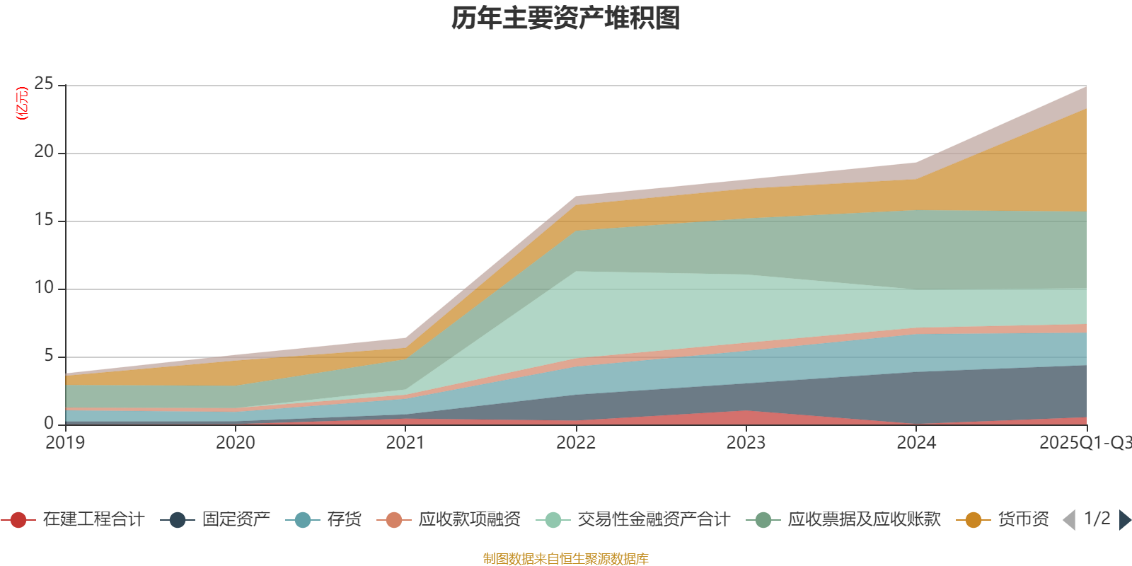 资产重大变化方面,截至2025年三季度末,公司货币资金较上年末增加232.43%,占公司总资产比重上升18.64个百分点;应收票据及应收账款较上年末减少3.29%,占公司总资产比重下降7.6个百分点;存货较上年末减少13.82%,占公司总资产比重下降4.79个百分点;固定资产较上年末减少0.17%,占公司总资产比重下降4.5个百分点。