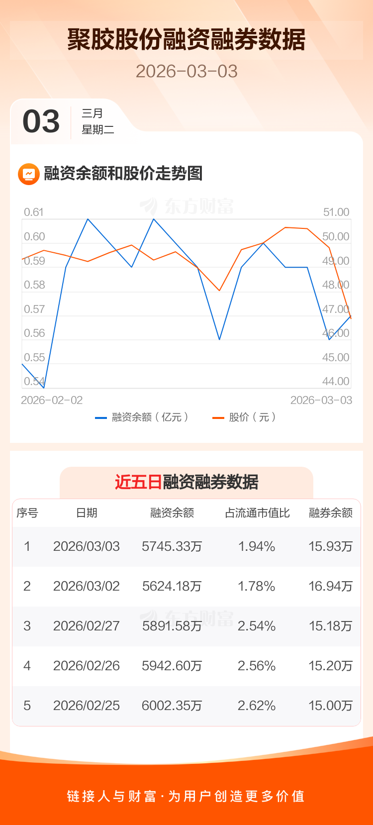 交易所最新数据显示,聚胶股份于2026年3月3日获融资买入780.30万元,融资偿还659.15万元,当日融资净买入121.15万元。目前,该股融资余额5745.33万,占流通市值比例为1.94%。