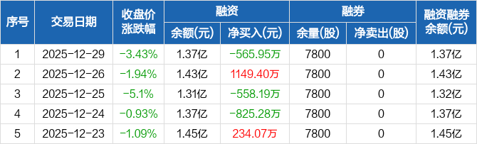 侨源股份:融资净偿还565.95万元,融资余额1.37亿元(12-29)