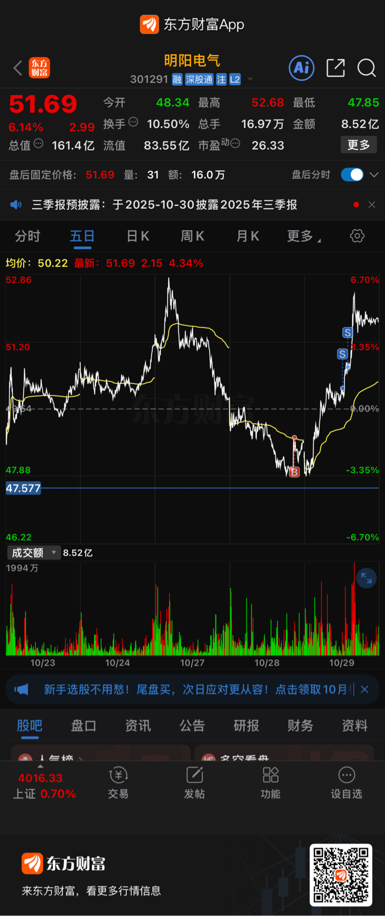 $明阳电气(SZ301291)$ 今天低位卖了,留一部分底仓,等他业绩大涨!