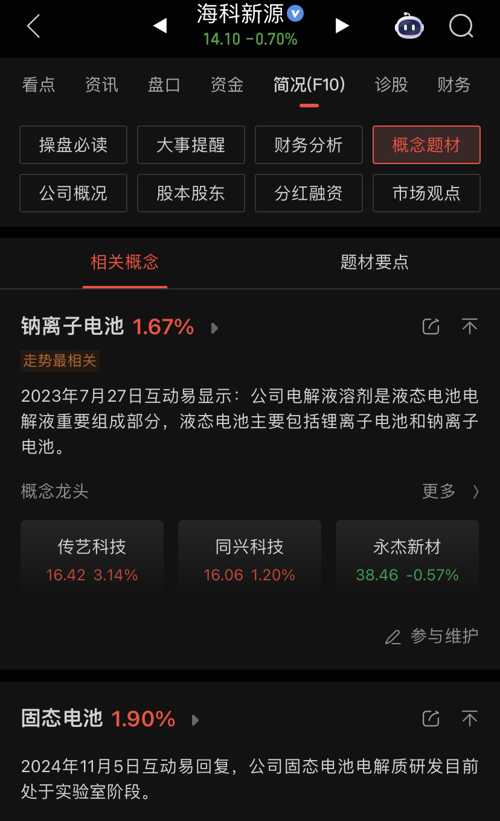 海科新源互动易表示:公司电解液溶剂是液态电池电解液重要组成部分,液态电池主要包括