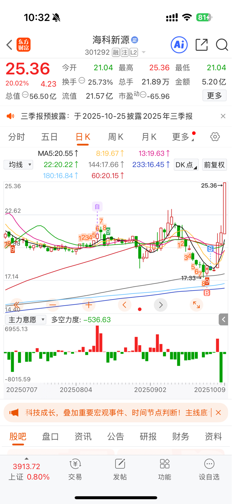 $海科新源(SZ301292)$ 满仓跑出来亏了七个点