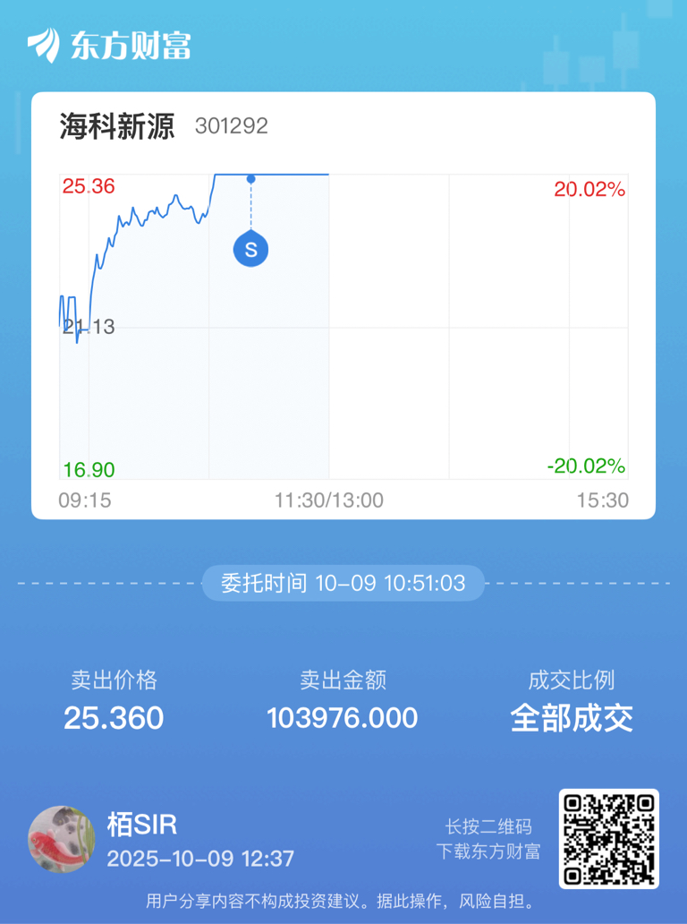 $海科新源(SZ301292)$ 买岀后复盘后就感觉卖早了.从K线型态分析.明后还有10厘米以上的行情冲高机会.希望下午打开涨停板后重新再买回来。