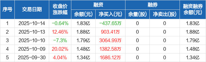 融资方面,当日融资买入7732.42万元,融资偿还8170.07万元,融资净偿还437.65万元。融券方面,融券卖出0股,融券偿还0股,融券余量0股,融券余额0元。融资融券余额合计1.83亿元。