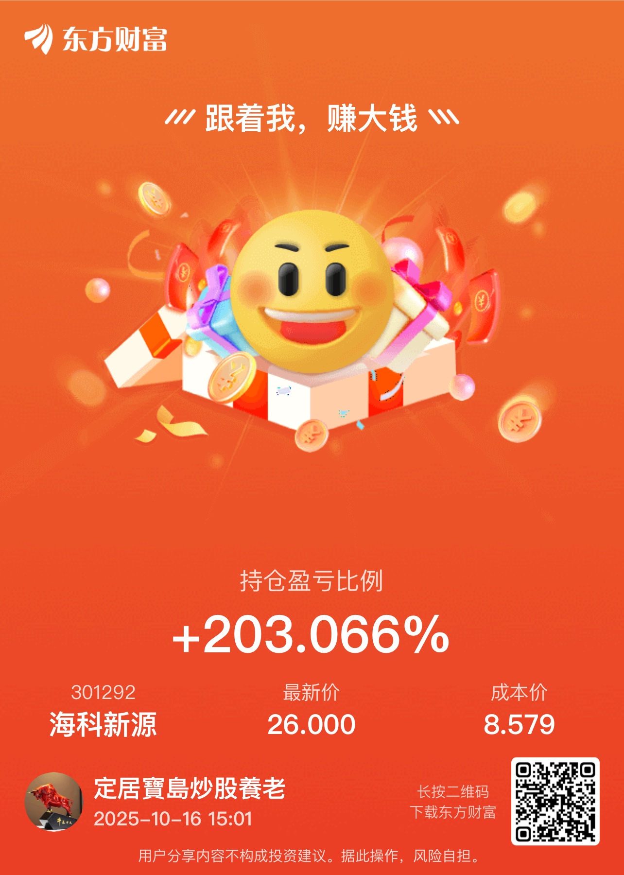 $海科新源(SZ301292)$ 两天大涨拉高没出,回想起来主力真的给了大家机会出货。都怪自己心贪了,今天绿的时候我卖出了,留了很小一部分。明天再看看。不拉的话明天也估计会出掉。如果拉起来,就在拿一拿。