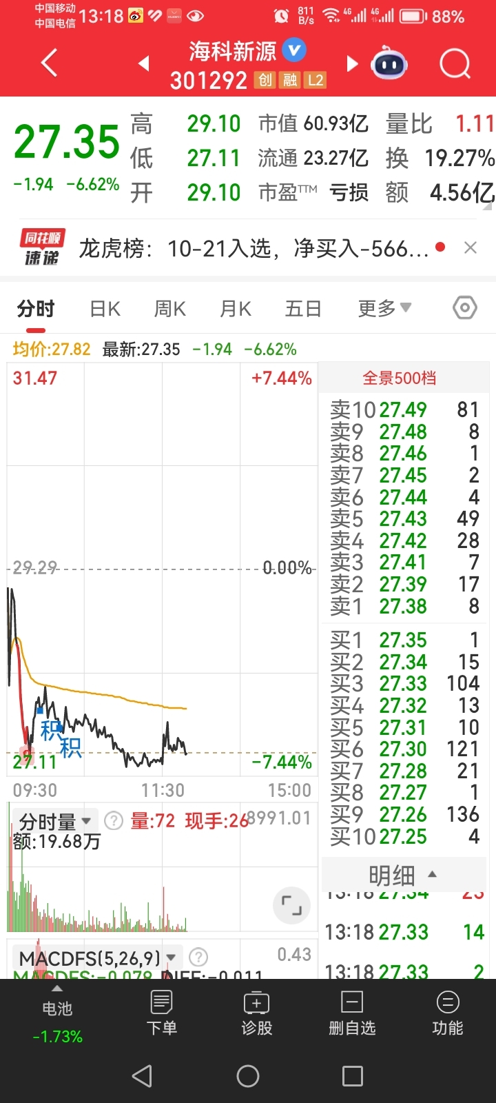 上午尾盘3次企图击穿27.20,下午继续横盘就是散户自由交易,要是拉升就是自救,可能今天反抽反包昨天的阴线,或许明天后天反抽反包双头选