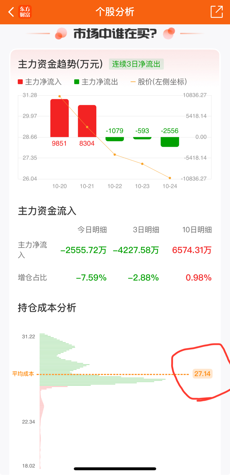 市场平均成本27.14元,说明除了主力资金,这十天八天买入的都被套牢了!
