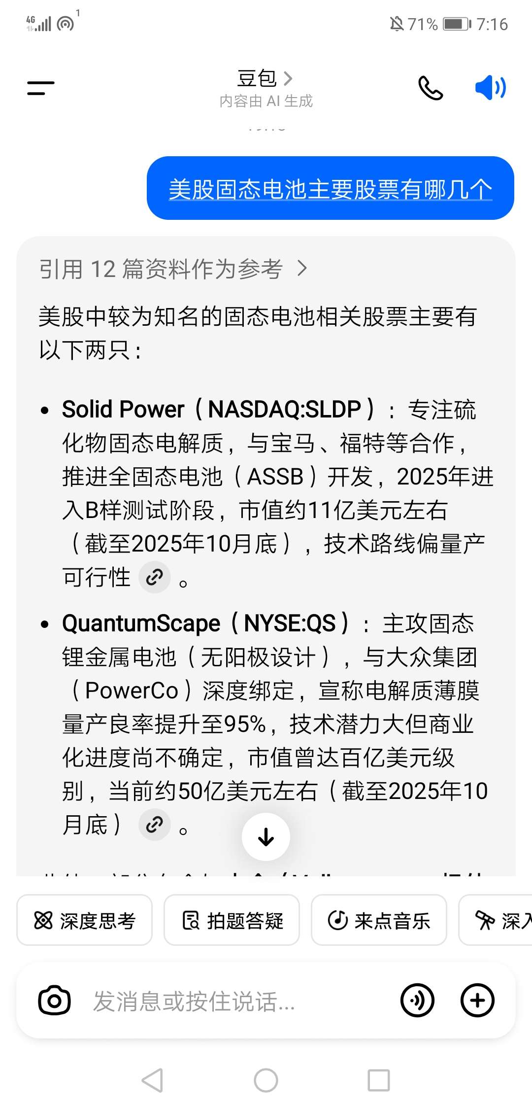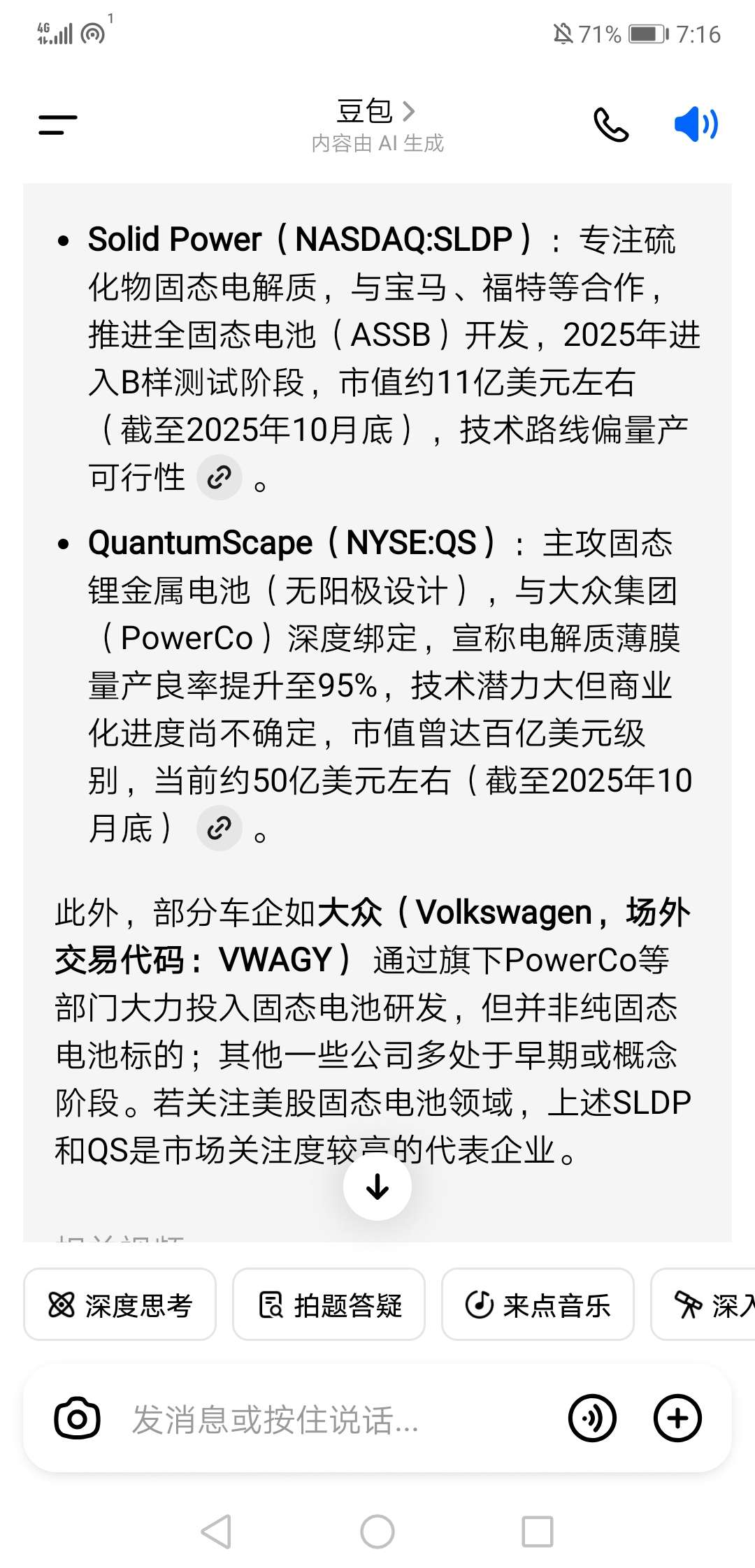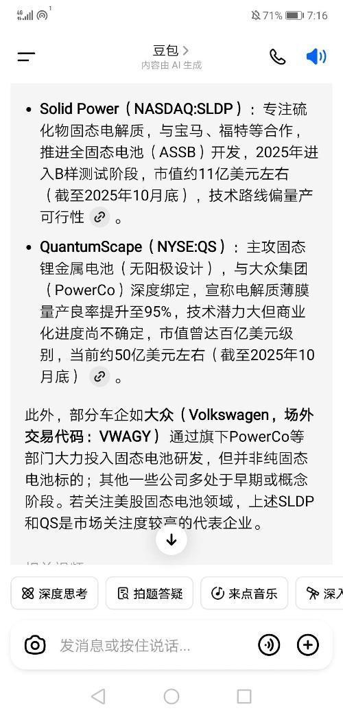 - QuantumScape(NYSE:QS):主攻固态锂金属电池(无阳极设计),与大众集团(PowerCo)深度绑定,宣称电解质薄膜量产良率提升至95%,技术潜力大但商业化进度尚不确定,市值曾达百亿美元级别,当前约50亿美元左右(截至2025年10月底) 。