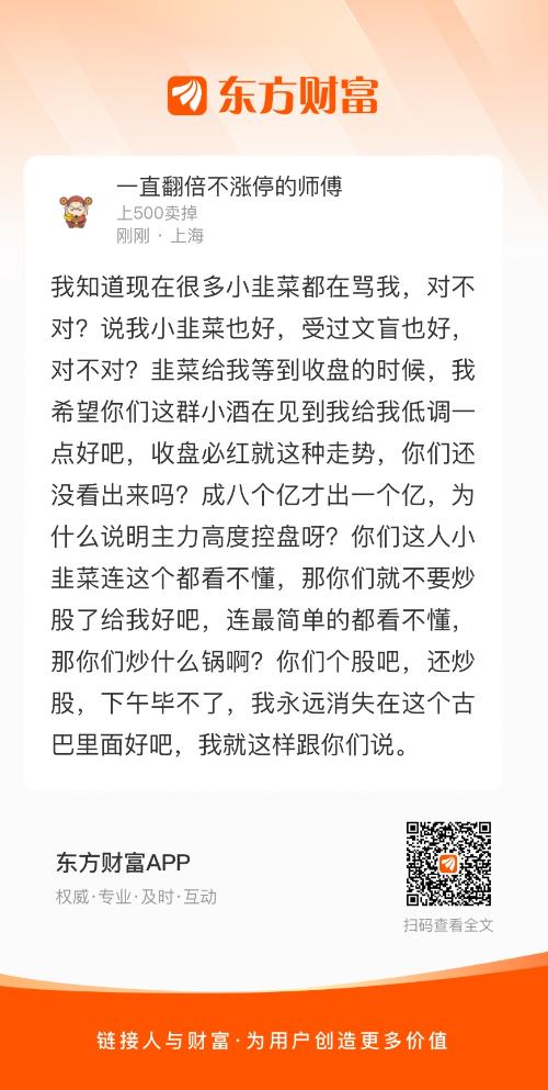 我知道现在很多小韭菜都在骂我,对不对?说我小韭菜也好,受过文盲也好,对不对?韭菜给我等到收盘的时候,我希望你们这群小酒在见到我给我低调一点好吧,收盘必红就这种走势,你们还没看出来吗?成八个亿才出一个亿,为什么说明主力高度控盘呀?你们这人小韭菜连这个都看不懂,那你们就不要炒股了给我好吧,连最简单的都看不懂,那你们炒什么锅啊?你们个股吧,还炒股,下午毕不了,我永远消失在这个古巴里面好吧,我就这样跟你们说。