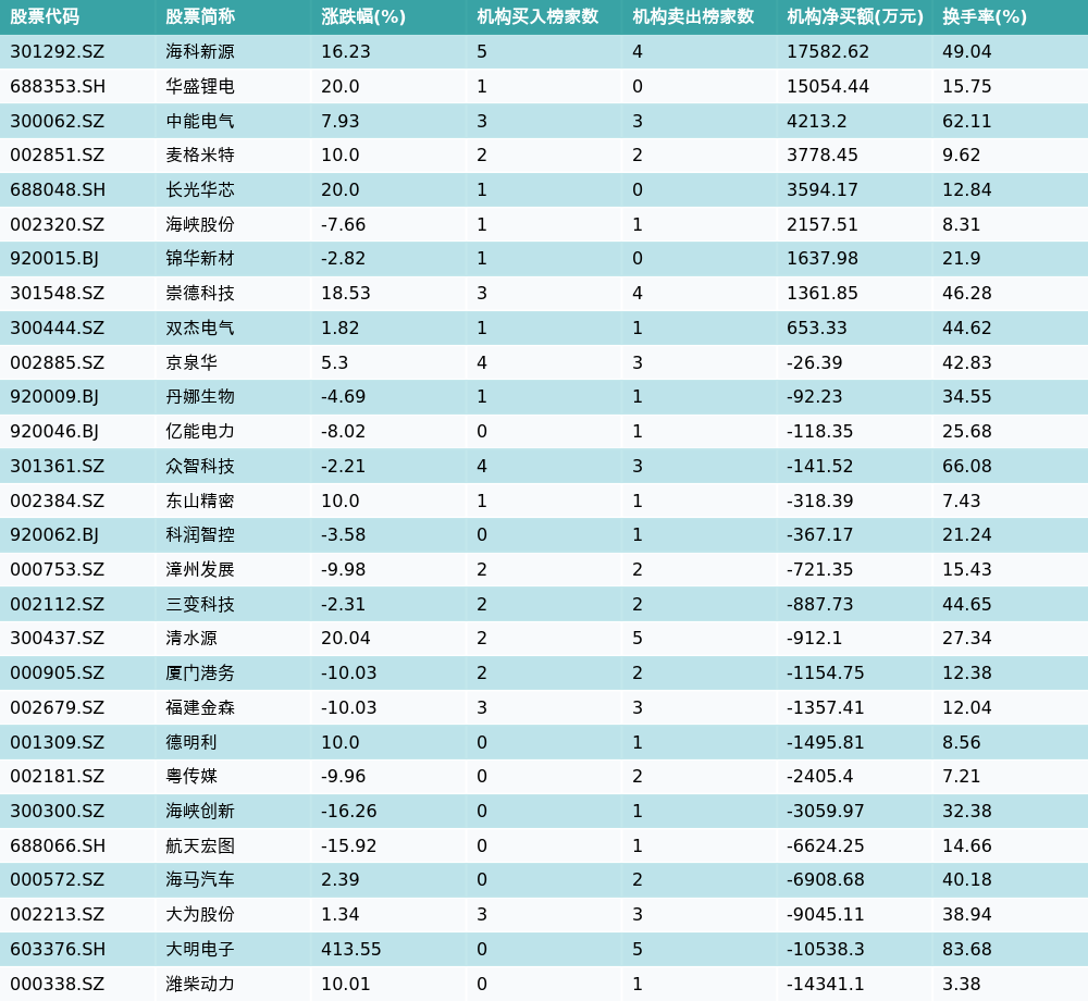 南财智讯11月6日电,南财金融终端数据显示,因当日异动登上龙虎榜的个股中,28只沪深A股龙虎榜出现了机构的身影,机构合计净卖出10482.46万元,具体来看,机构净买入9只个股,净卖出19只个股。其中,机构净买入前三分别为海科新源(301292.SZ)、华盛锂电(688353.SH)与中能电气(300062.SZ),详情见下图:机构净卖出的个股中,前三分别为潍柴动力(000338.SZ)、大明电子(603376.SH)与大为股份(002213.SZ)。