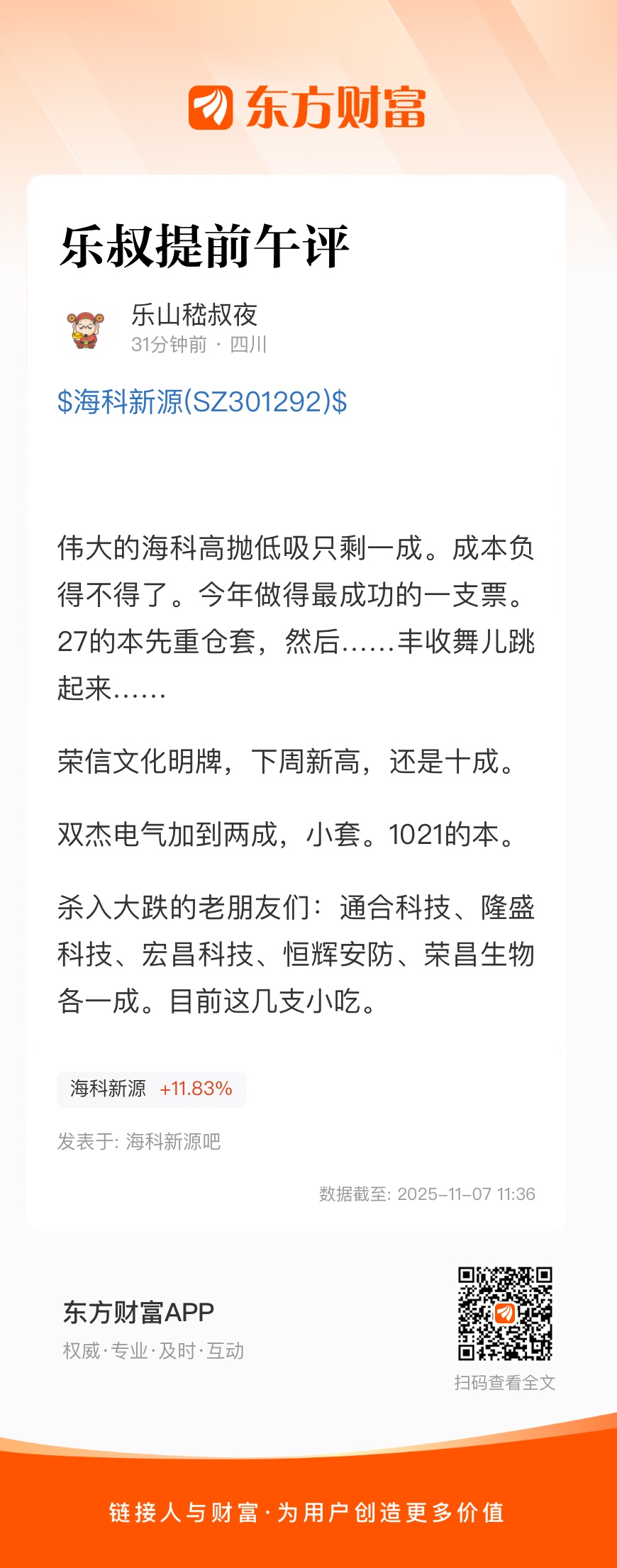 伟大的海科高抛低吸只剩一成。成本负得不得了。今年做得最成功的一支票。27的本先重仓套,然后……丰收舞儿跳起来……