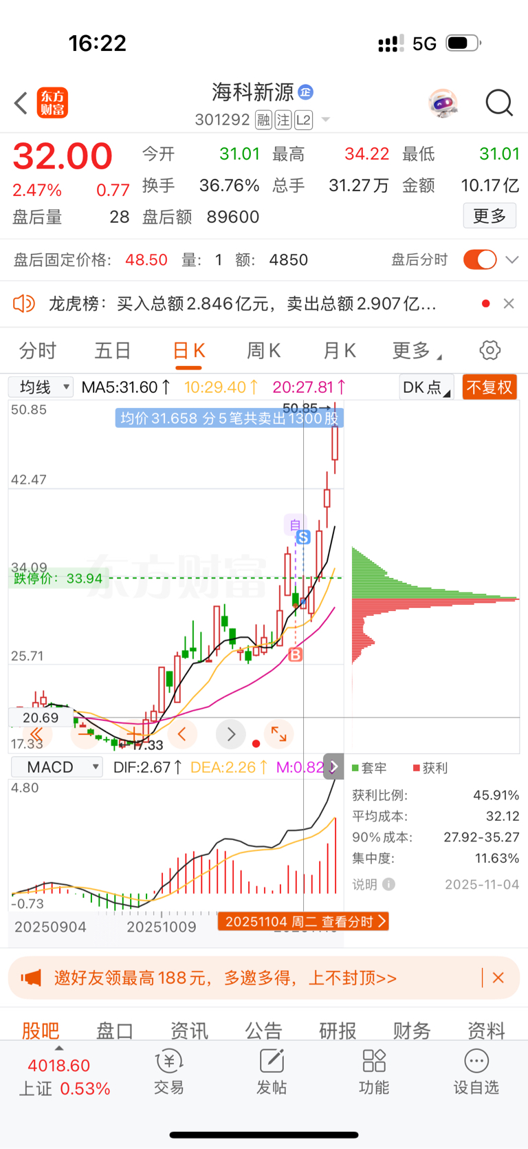 $海科新源(SZ301292)$ 这天要不会落就拿住了,没那命