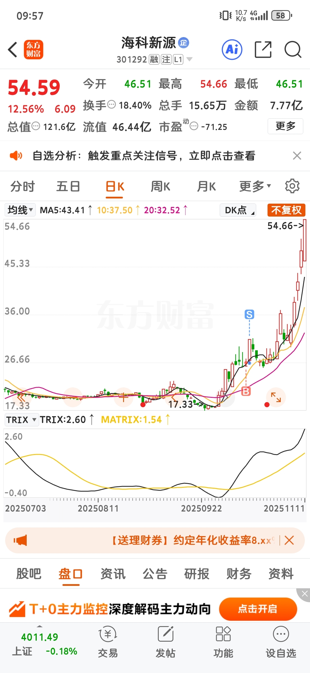 $海科新源(SZ301292)$ 卖飞了110个点