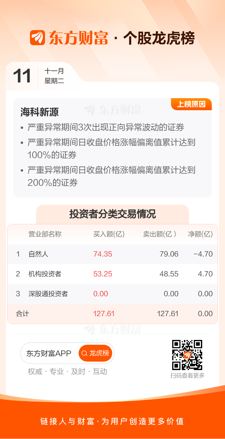 交易所2025年11月11日公布的交易公开信息显示,海科新源因成为日换手率达到30%的前5只证券、严重异常期间3次出现正向异常波动的证券、严重异常期间日收盘价格涨幅偏离值累计达到100%的证券、严重异常期间日收盘价格涨幅偏离值累计达到200%的证券、连续三个交易日内,涨幅偏离值累计达到30%的证券上榜。海科新源当日收报56.65元,涨跌幅16.80%,偏离值39.19%,换手率39.19%,成交额17.65亿。严重异常期间10月30日至11月11日,期间涨幅104.44%,区间成交额127.61亿。严重异常期间10月30日至11月11日,期间涨幅104.44%,累计偏离值107.49%,区间成交额127.61亿。严重异常期间9月29日至11月11日,期间涨幅215.07%,累计偏离值214.68%,区间成交额239.22亿。异常期间11月10日至11月11日,期间涨幅33.55%,累计偏离值34.50%,区间成交额35.24亿。
