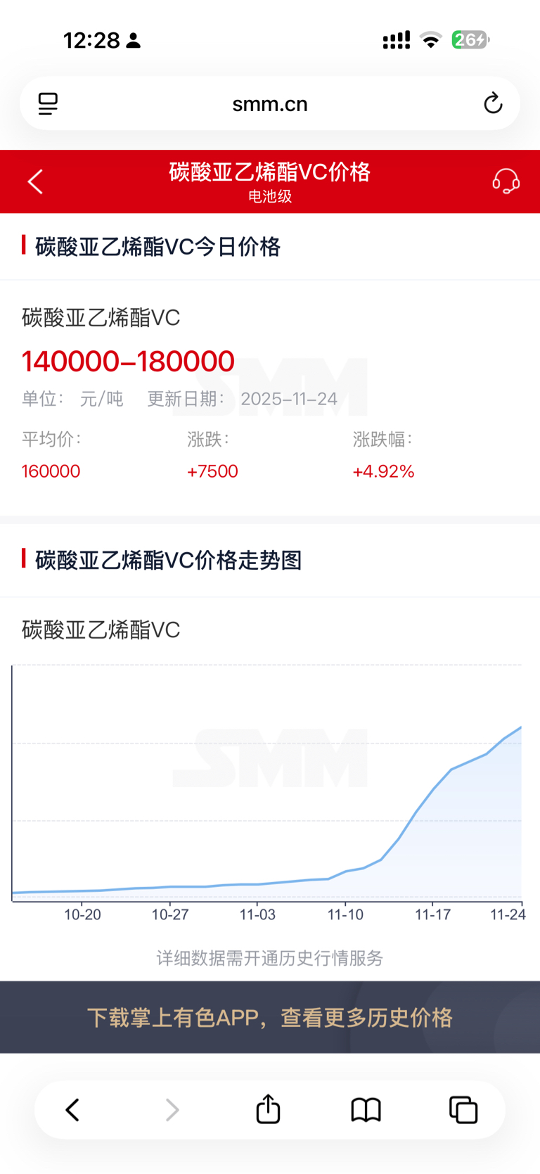 VC依然强势上涨7500,六氟磷酸锂趋势平稳小涨1000