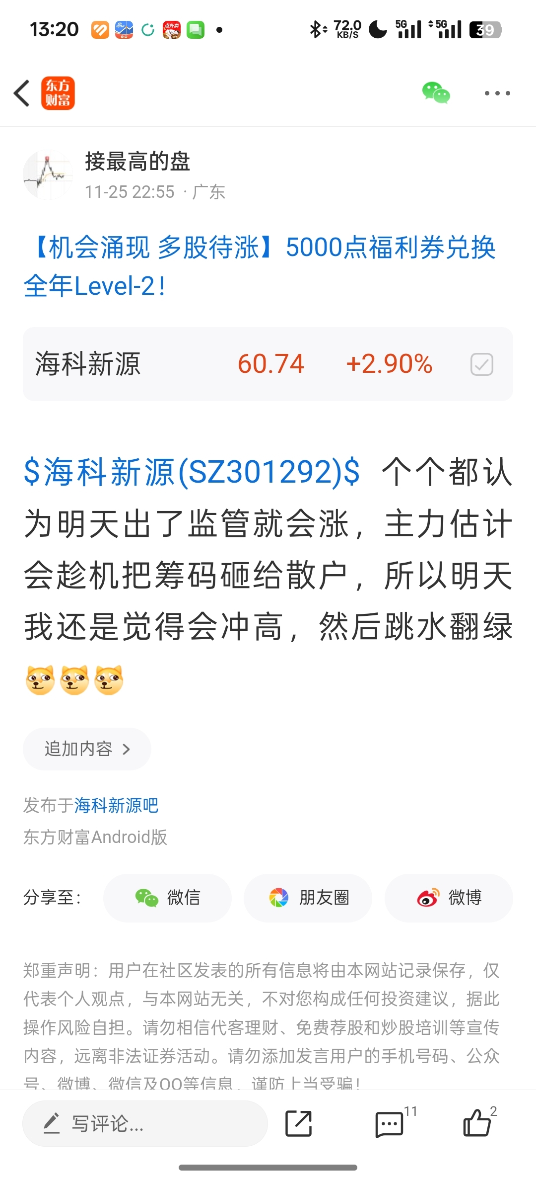$海科新源(SZ301292)$ 今天的走势基本跟我昨晚的预测一样,就等翻绿了