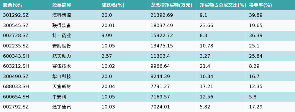 南财智讯11月27日电,南财金融终端数据显示,因当日异动登上龙虎榜的个股中,资金净买入最多的前三位分别是海科新源(301292.SZ)、联得装备(300545.SZ)与特一药业(002728.SZ)。其中排名第一的海科新源净买额达2.14亿元,占总成交金额的9.1%。海科新源当日收盘上涨20.0%,换手率为39.89%,净买入额前10个股详情见下图: