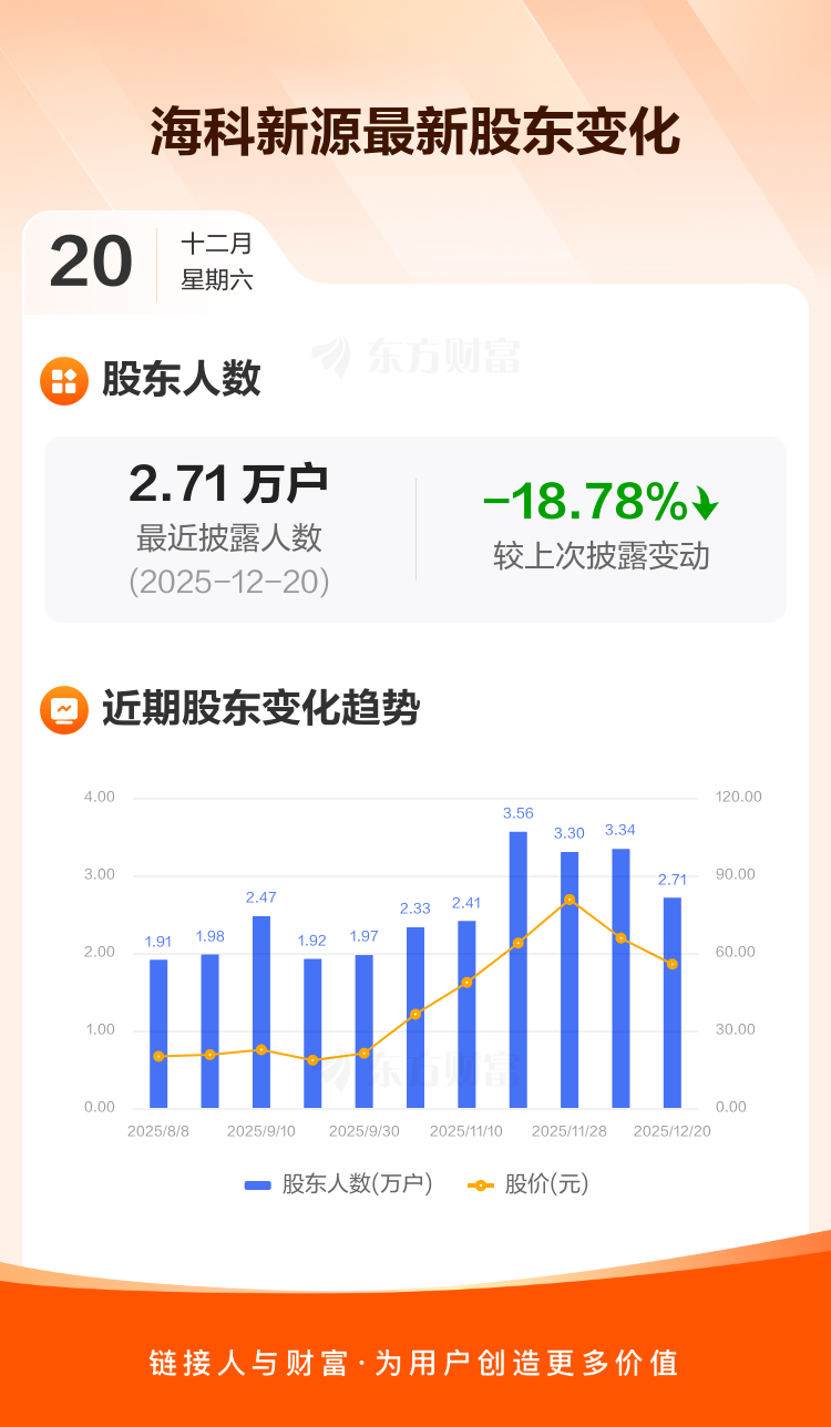 海科新源:截至12月20日最新股东户数2.71万户,较上期减少18.78%