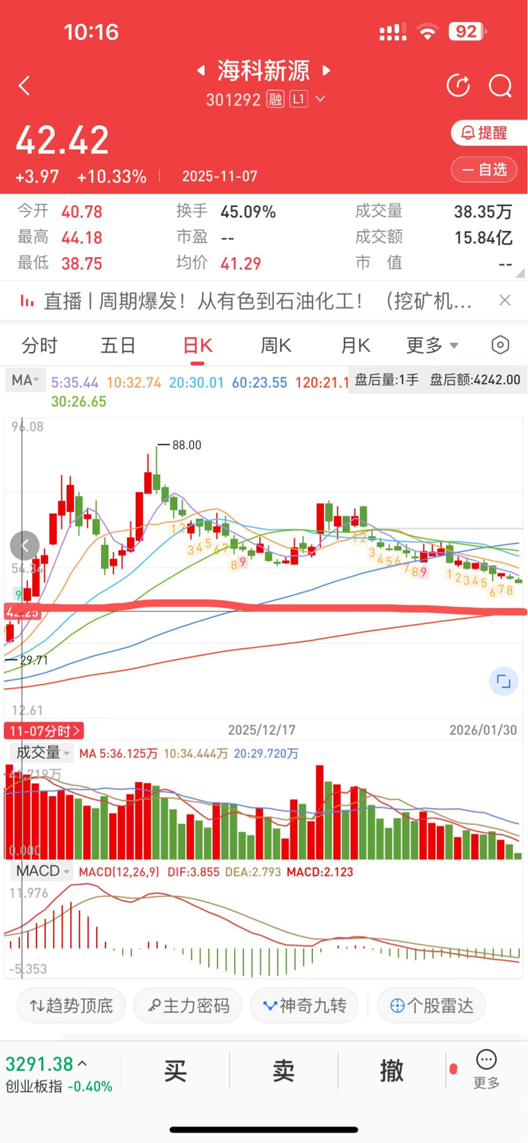 $海科新源(SZ301292)$ 支撑位42元左右,如果破42就是38元,大家赶紧跑