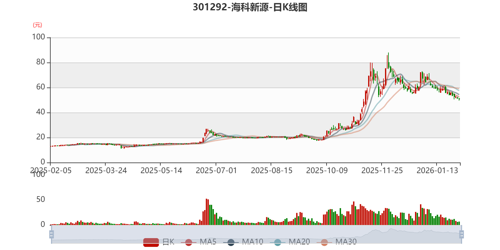 中证智能财讯海科新源(301292)1月30日晚间披露2025年度业绩预告,预计2025年实现营业收入50亿元至51亿元;归母净利润亏损1.75亿元至1.97亿元,上年同期亏损2.67亿元;扣非净利润亏损1.82亿元至2.05亿元,上年同期亏损2.7亿元。以最新收盘价计算,市净率(LF)约4.18倍,市销率(TTM)约2.24倍。