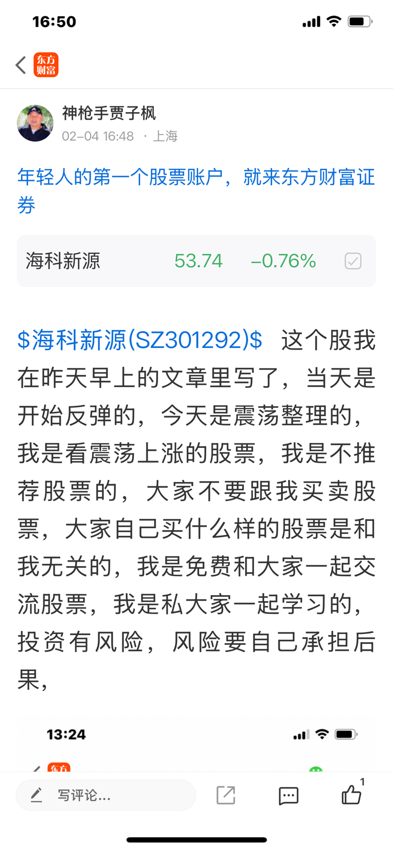 $海科新源(SZ301292)$ 这个股我是二月三号早上五点发表文章写了当天开始反弹的股票,我是不推荐股票的,大家不要跟我买卖股票,大家自己买什么样的股票是和我无关的,因为我是免费和大家一起交流股票,我是和大家一起学习的,我的观点仅供参考,投资有风险,风险要自己承担后果,