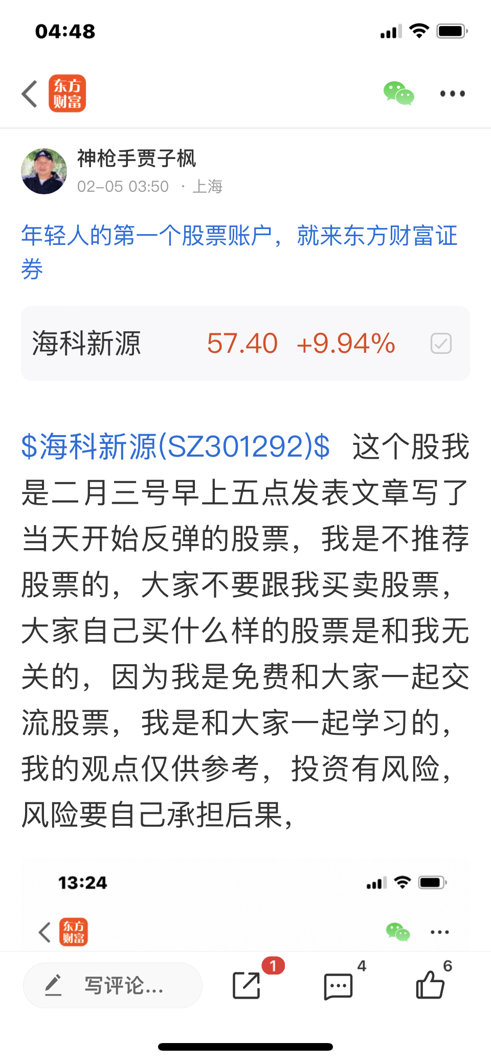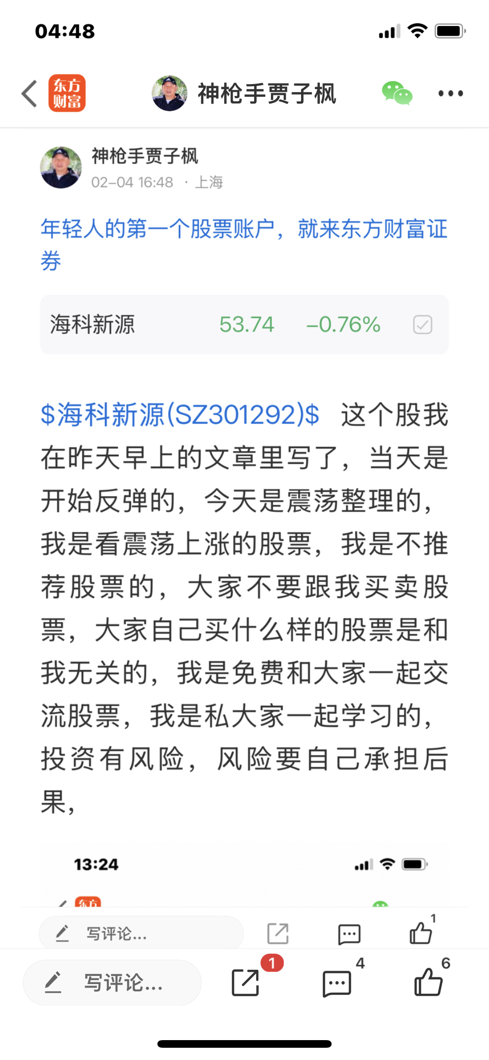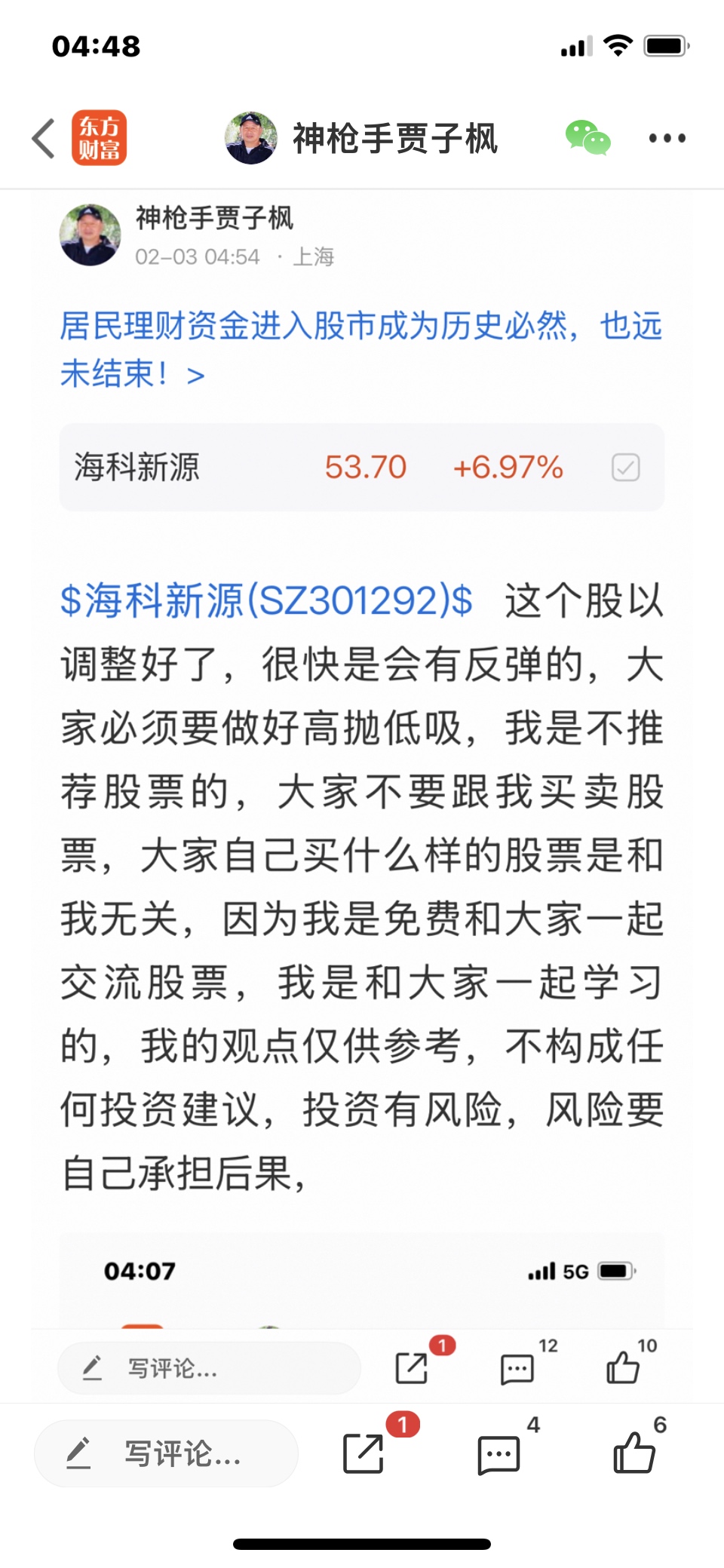 $海科新源(SZ301292)$ 这个股我是二月三号早上五点发表文章开始反弹的股票,大家不论看好什么样的股票,必须要做好高抛低吸,我是不推荐股票的,大家不要跟我买卖股票,大家自己买什么样的股票是和我无关的,因为我是免费和大家一起交流股票,我是和大家一起学习的,我的观点仅供参考,不构成任何投资建议,投资有风险,风险要自己承担后果,