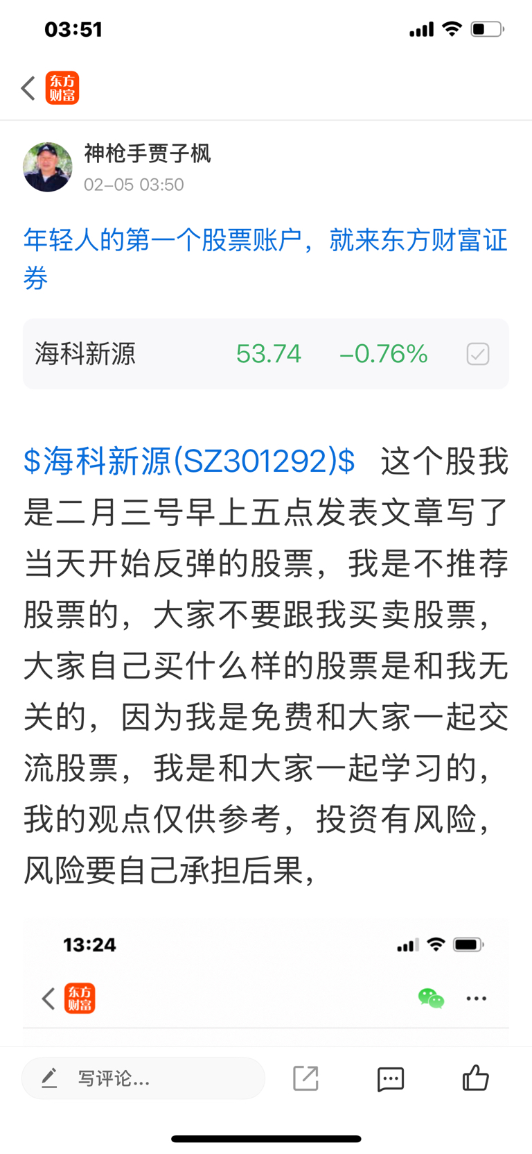 $海科新源(SZ301292)$ 这个股我是二月三号发表文章看反弹的股票,大家不要追高买入,必须要做好高抛低吸,我是不推荐股票的,大家不要跟我买卖股票,大家自己买什么样的股票是和我无关的,因为我是免费和大家一起交流股票,我是和大家一起学习的,我的观点仅供参考,投资有风险,风险要自己承担后果,