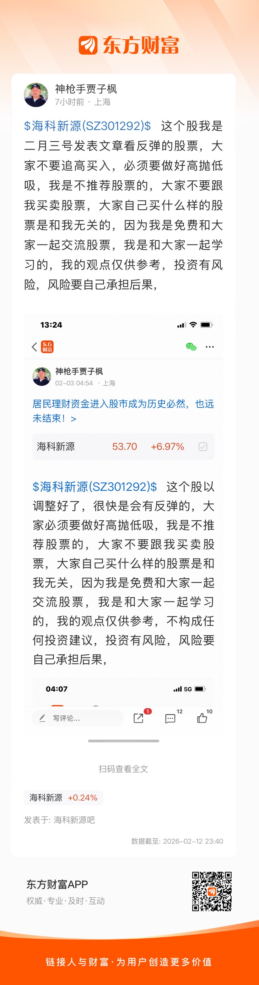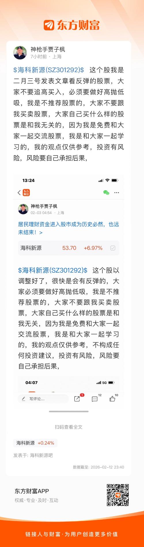 $海科新源(SZ301292)$ 这个股我是二月三号发表文章看反弹的股票,大家不要追高买入,必须要做好高抛低吸,我是不推荐股票的,大家不要跟我买卖股票,大家自己买什么样的股票是和我无关的,因为我是免费和大家一起交流股票,我是和大家一起学习的,我的观点仅供参考,投资有风险,风险要自己承担后果,