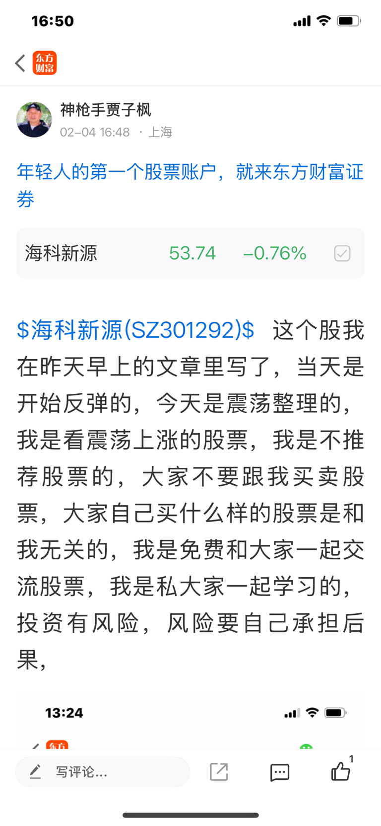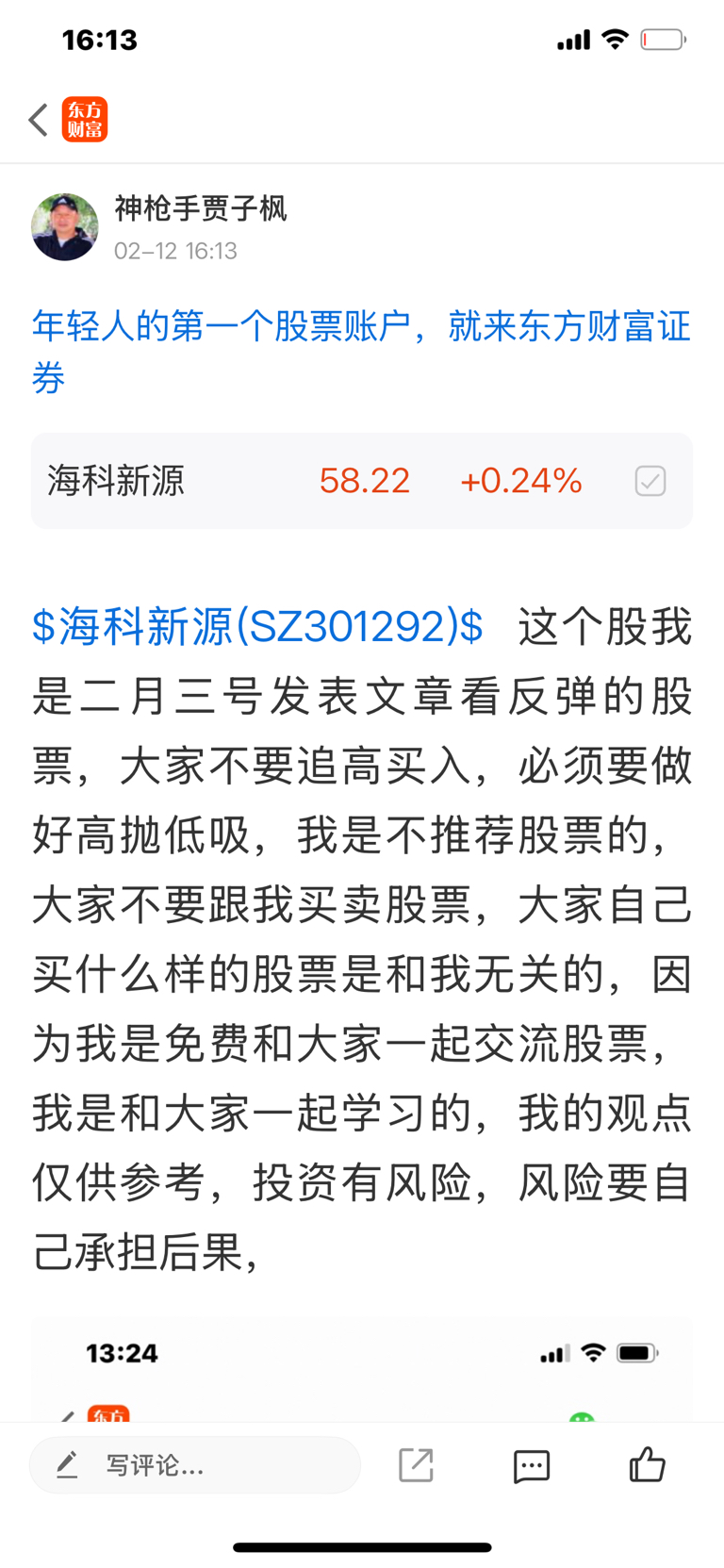 $海科新源(SZ301292)$ 这个股我是二月三号发表文章看反弹的股票,大家不要追高买入,必须要似好高抛低吸,我是不推荐股票的,大家不要跟我买卖股票,大家自己买什么样的股票是和我无关的,因为我是免费和大家一起交流股票,我是和大家一起学习的,我的观点仅供参考,投资有风险,风险要自己承担后果,