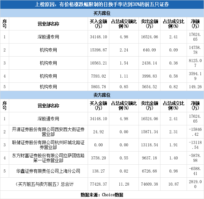 深交所2026年1月7日交易公开信息显示,三博脑科因属于有价格涨跌幅限制的日换手率达到30%的前五只证券而登上龙虎榜。三博脑科当日报收93.82元,涨跌幅为10.45%,换手率46.31%,振幅15.66%,成交额68.62亿元。
