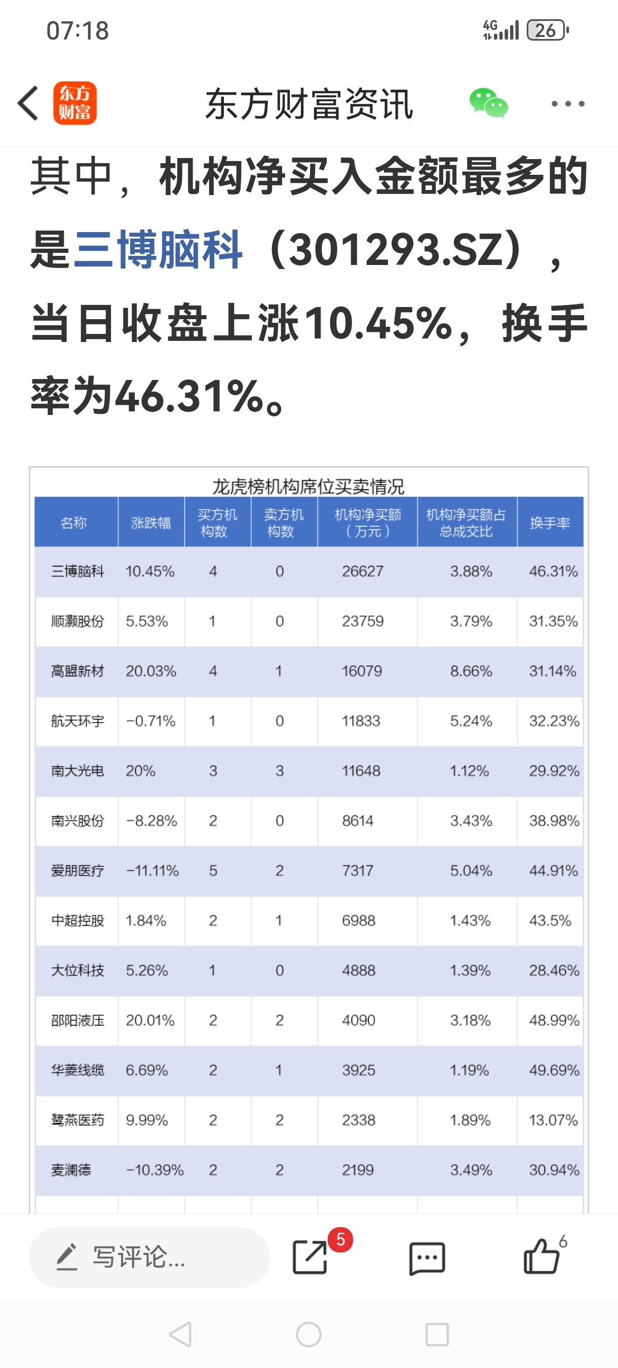 $三博脑科(SZ301293)$ 龙虎榜机构买入第一!