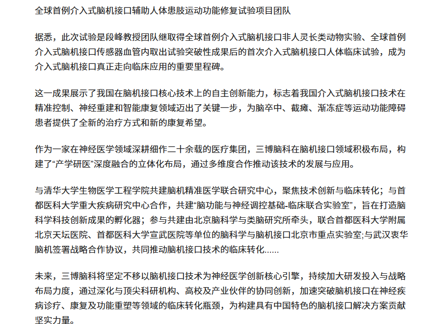 三博参与完成介入式脑机接口实现人体患肢运动功能修复