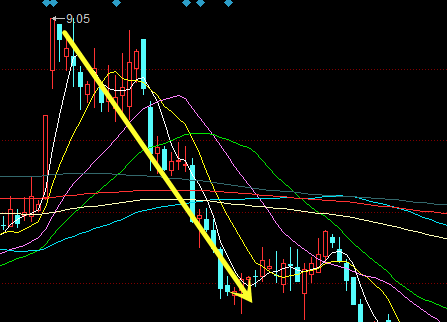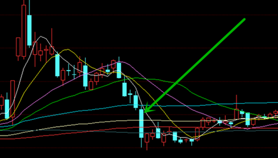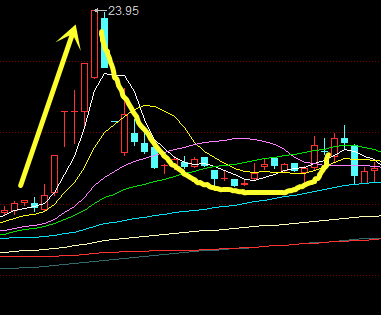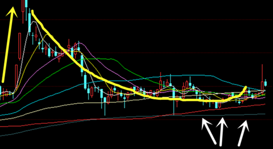 大家看上图,第一个黄色箭头,就是一波连续涨停。黄色的线代表的是圆弧式下跌,意味着这个下跌并不能是直线的,也不能是倾斜角度太大的,而是这种圆弧式的。白色箭头指向处,有200日线和250日线两条大级别均线支撑。