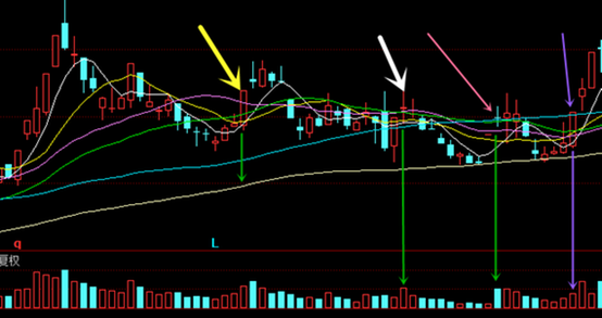 我们一步一步来解析一下。首先,黄色箭头的地方突破了30日线,但是不能用三零战法买入,因为距离下方大级别均线太远了。其次,白色箭头的地方,回踩了120日线没破,突破了30天线,也不能买入,因为成交量太大了。三零战法的卖点就是异常放量,突破的量太大不行。粉红色箭头一个道理,突破的量太大。