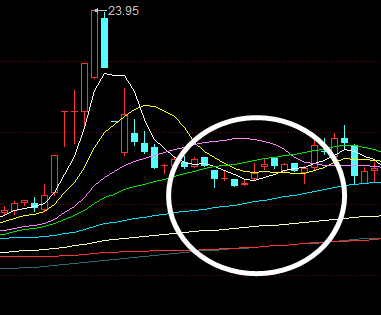 第三个条件,大级别均线支撑。这个股表面上看围绕着大级别均线震荡,好像是有支撑的效果。但是,我们仔细看的时候,发现早就跌破了大级别均线了。箭头处那一天就已经决定该股不是三零战法了。必须是至少不能破其中一条均线,即便是跌破后第二天拉回来也不行。