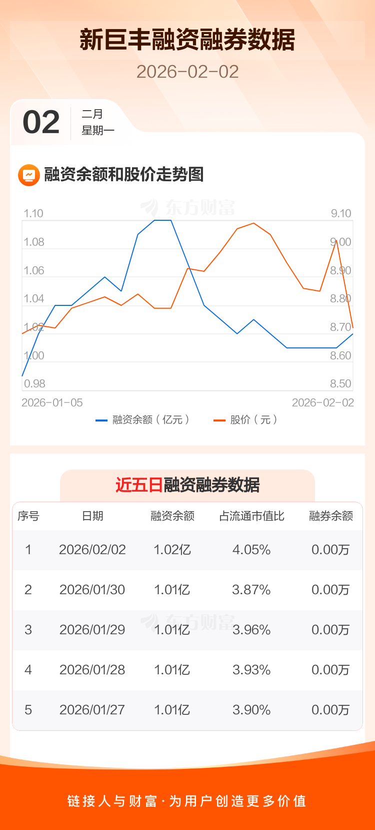 交易所最新数据显示,新巨丰于2026年2月2日获融资买入517.40万元,融资偿还406.24万元,当日融资净买入111.16万元。目前,该股融资余额1.02亿,占流通市值比例为4.05%。