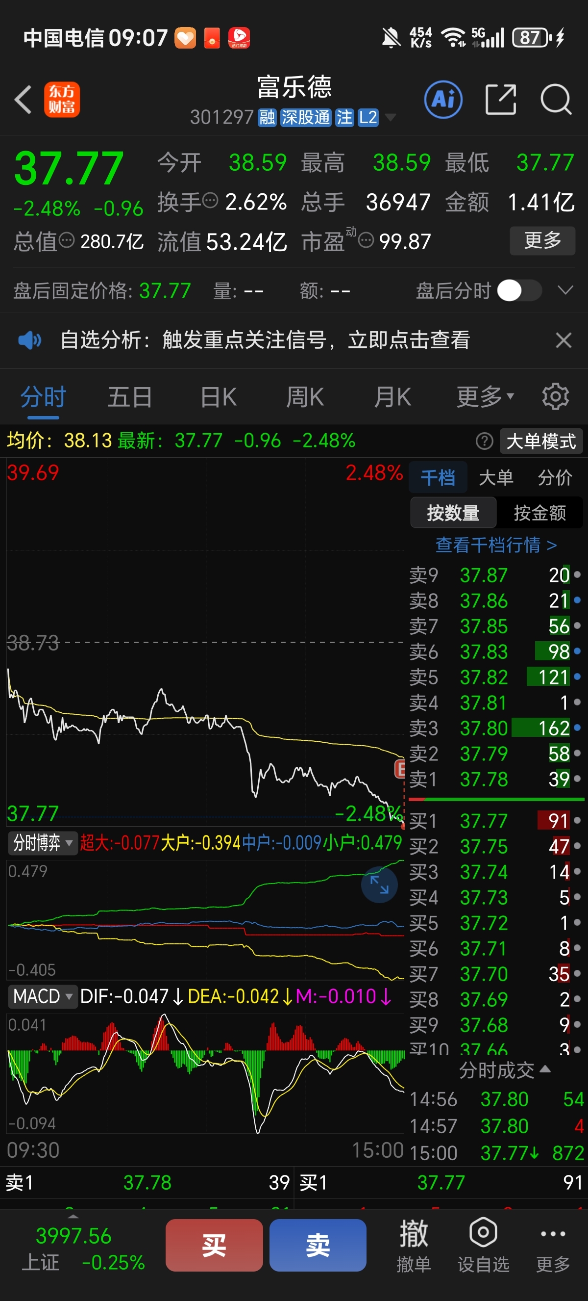 $富乐德(SZ301297)$ 37.77是不是底,号,今天尾盘抄底了,准备拿着,丛高底跌下来那么多,我都不相信,它不再来一波。