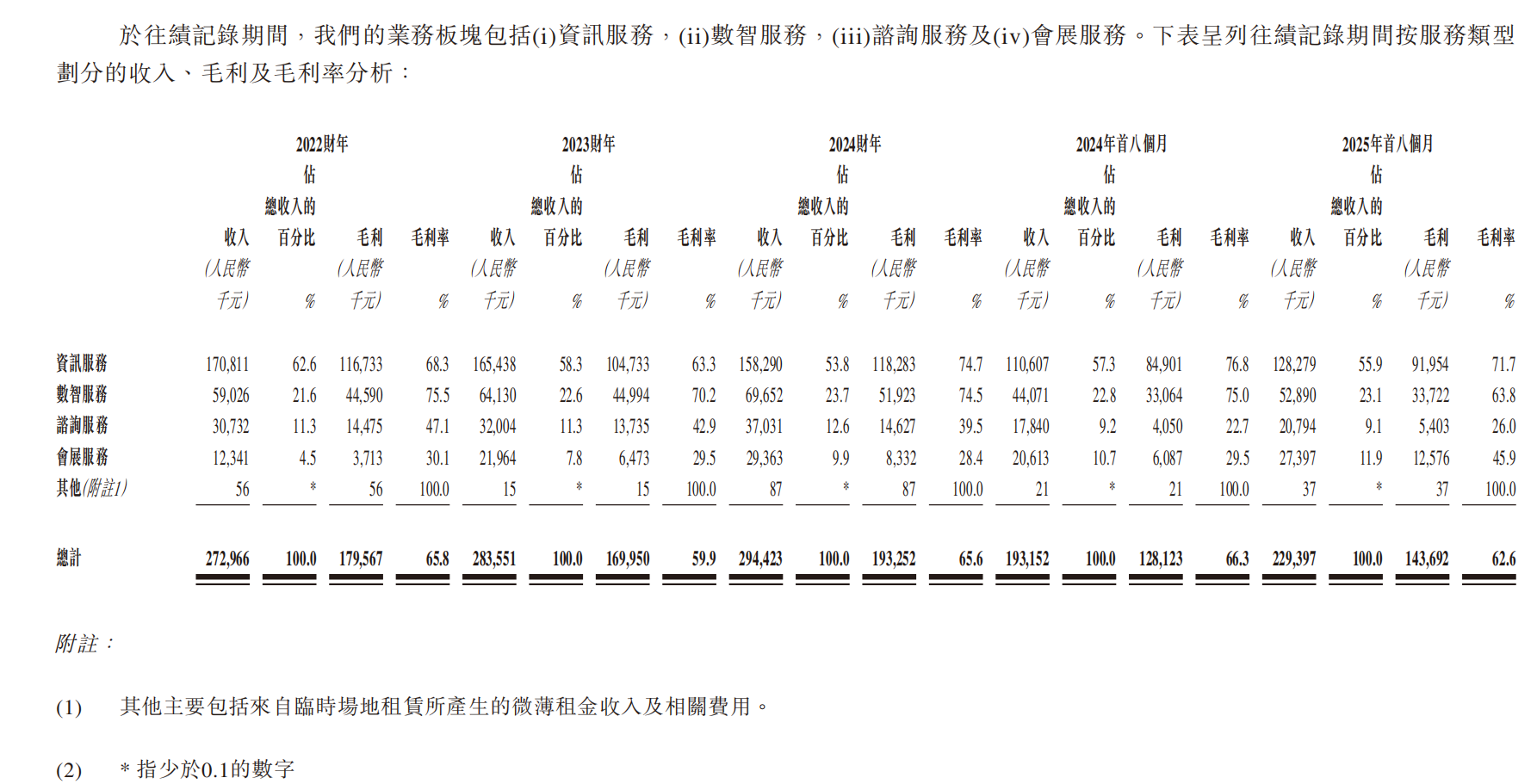 根据公司本次递交的招股书,2022-2024财年(下同),公司的营业收入从2.73亿元增长至2.94亿元,同比依次增长3.9%与3.8%,增速较为平缓。2025年前八个月收入为2.29亿元,同比增速达到18.77%,这得益于数智服务及会展服务的拉动,但只占2024年全年收入的77.9%。公司四大业务板块中,核心业务的资讯服务收入在2024年出现下滑,减少了710万元;同时,数智服务作为增长核心,占比仅23.1%,尚未形成强增长引擎。海外收入方面,2022-2025年前八个月的收入占比为7.2%-12.3%,其中2025年前八个月2827万元,对公司总营收的提升助力有限。