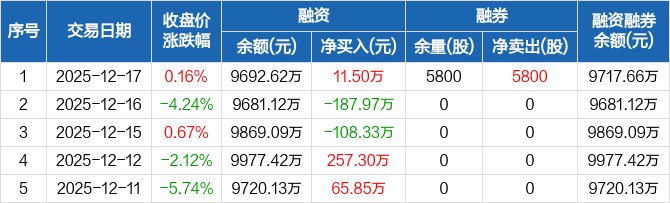 远翔新材:融资净买入11.5万元,融资余额9692.62万元(12-17)