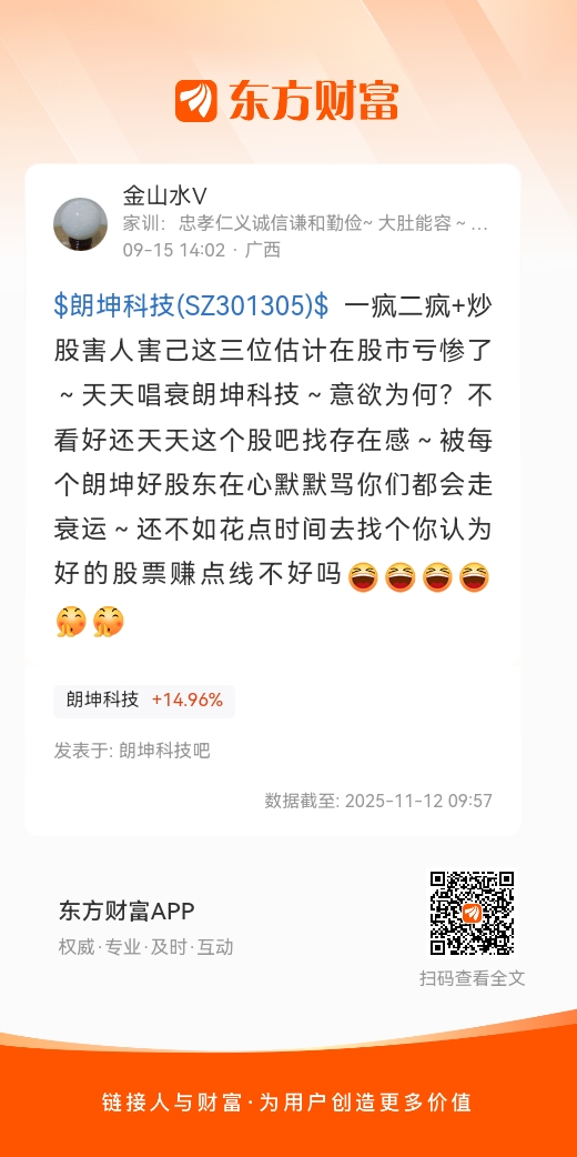 $朗坤科技(SZ301305)$ 一疯二疯+炒股害人害己这三位估计在股市亏惨了~天天唱衰朗坤科技~意欲为何?不看好还天天这个股吧找存在感~被每个朗坤好股东在心默默骂你们都会走衰运~还不如花点时间去找个你认为好的股票赚点线不好吗