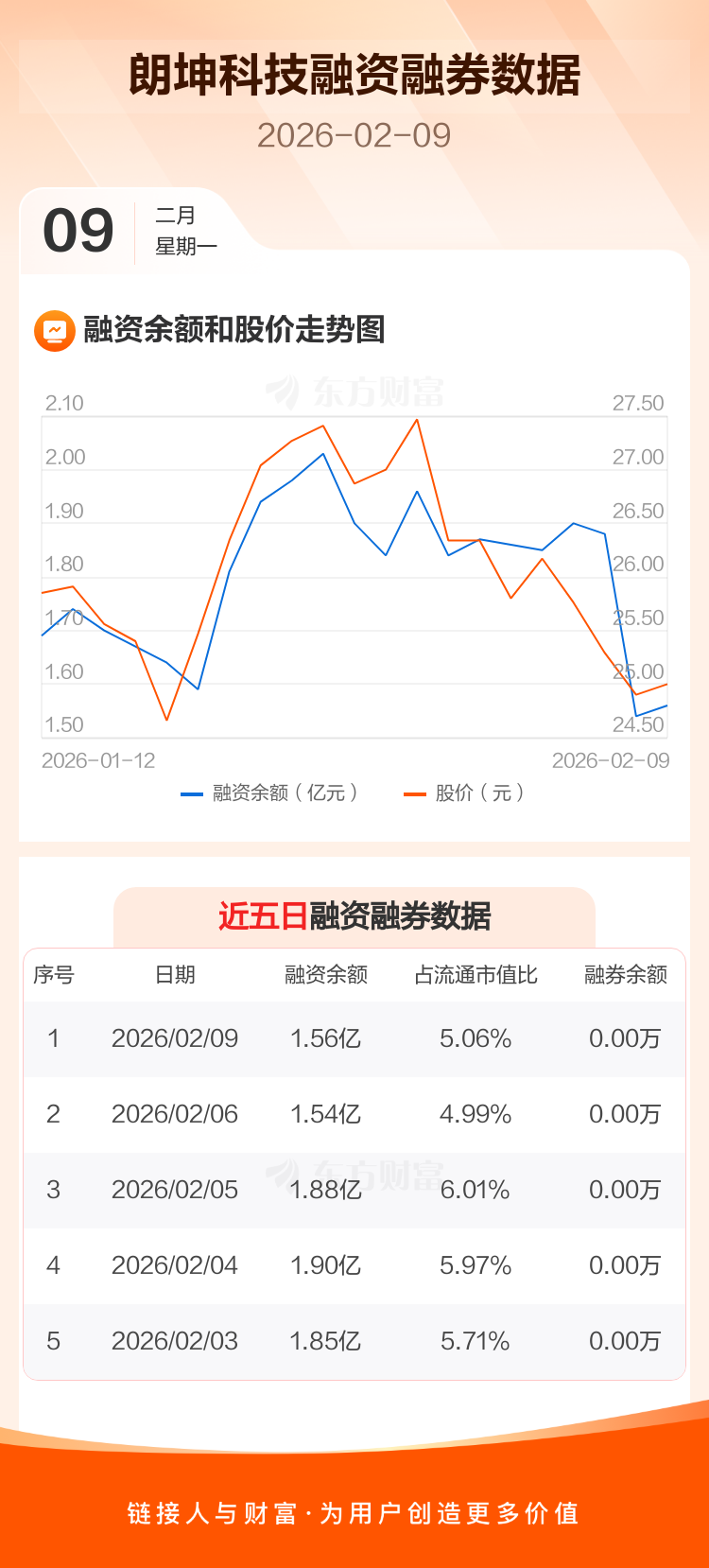 交易所最新数据显示,朗坤科技于2026年2月9日获融资买入1606.32万元,融资偿还1331.02万元,当日融资净买入275.31万元。目前,该股融资余额1.56亿,占流通市值比例为5.06%。